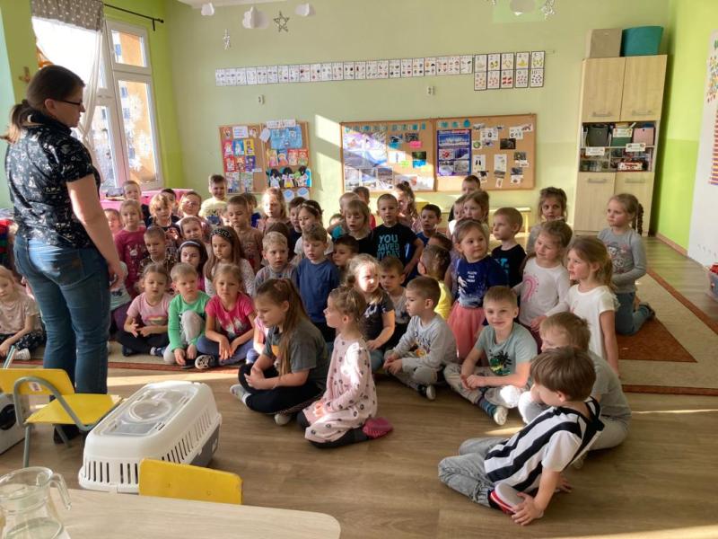 9 lutego do naszego przedszkola przyszła z wizytą pracownica rudzkiego schroniska, by podziękować za dary przekazywane na potrzeby tamtejszych zwierząt. Towarzyszyła jej kotka Fredzia, która z racji podeszłego wieku  jest rezydentką w schronisku. Dzieci z zainteresowaniem wysłuchały opowieści o zasadach działania schroniska, zwierzętach w nim przebywających. Dowiedziały się także, jak dbać o swojego pupila, by był zdrowy i szczęśliwy. Przedszkolaki chętnie opowiadały o swoich doświadczeniach w opiece nad zwierzętami. Na koniec wizyty każdy chętny mógł pogłaskać Fredzię, która ze spokojem przyjmowała ogromne zainteresowanie swoją osobą.