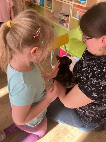 9 lutego do naszego przedszkola przyszła z wizytą pracownica rudzkiego schroniska, by podziękować za dary przekazywane na potrzeby tamtejszych zwierząt. Towarzyszyła jej kotka Fredzia, która z racji podeszłego wieku  jest rezydentką w schronisku. Dzieci z zainteresowaniem wysłuchały opowieści o zasadach działania schroniska, zwierzętach w nim przebywających. Dowiedziały się także, jak dbać o swojego pupila, by był zdrowy i szczęśliwy. Przedszkolaki chętnie opowiadały o swoich doświadczeniach w opiece nad zwierzętami. Na koniec wizyty każdy chętny mógł pogłaskać Fredzię, która ze spokojem przyjmowała ogromne zainteresowanie swoją osobą.