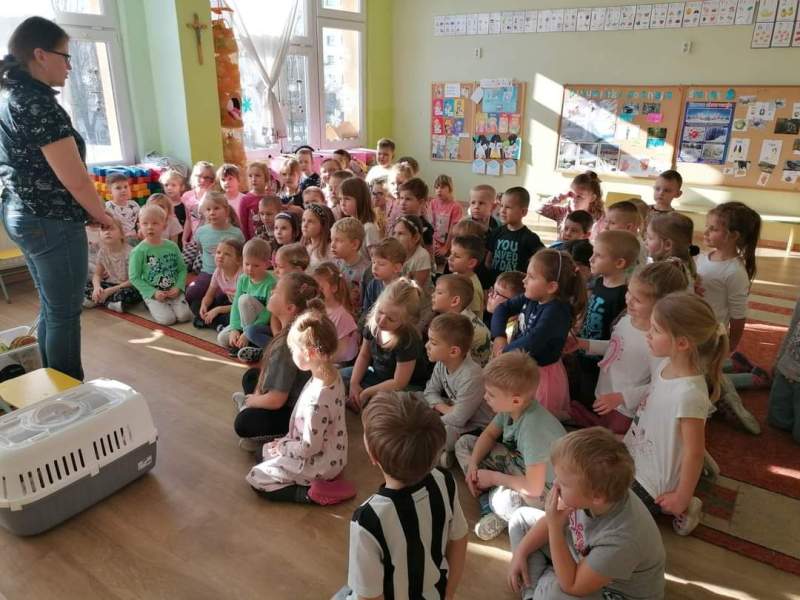 9 lutego do naszego przedszkola przyszła z wizytą pracownica rudzkiego schroniska, by podziękować za dary przekazywane na potrzeby tamtejszych zwierząt. Towarzyszyła jej kotka Fredzia, która z racji podeszłego wieku  jest rezydentką w schronisku. Dzieci z zainteresowaniem wysłuchały opowieści o zasadach działania schroniska, zwierzętach w nim przebywających. Dowiedziały się także, jak dbać o swojego pupila, by był zdrowy i szczęśliwy. Przedszkolaki chętnie opowiadały o swoich doświadczeniach w opiece nad zwierzętami. Na koniec wizyty każdy chętny mógł pogłaskać Fredzię, która ze spokojem przyjmowała ogromne zainteresowanie swoją osobą.