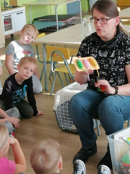 9 lutego do naszego przedszkola przyszła z wizytą pracownica rudzkiego schroniska, by podziękować za dary przekazywane na potrzeby tamtejszych zwierząt. Towarzyszyła jej kotka Fredzia, która z racji podeszłego wieku  jest rezydentką w schronisku. Dzieci z zainteresowaniem wysłuchały opowieści o zasadach działania schroniska, zwierzętach w nim przebywających. Dowiedziały się także, jak dbać o swojego pupila, by był zdrowy i szczęśliwy. Przedszkolaki chętnie opowiadały o swoich doświadczeniach w opiece nad zwierzętami. Na koniec wizyty każdy chętny mógł pogłaskać Fredzię, która ze spokojem przyjmowała ogromne zainteresowanie swoją osobą.