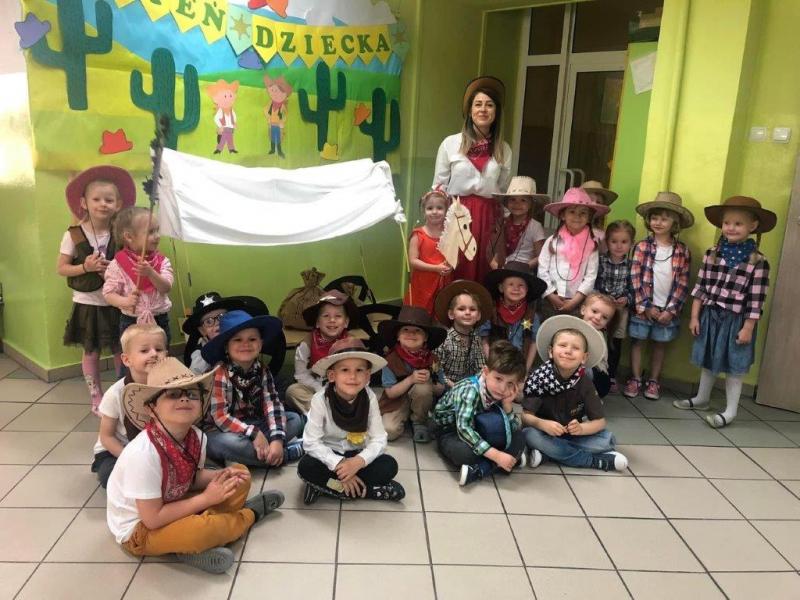 1.czerwca w naszym przedszkolu odbyła się prawdziwa podróż w czasie. Przenieśliśmy się  na Dziki Zachód – do czasów zręcznych kowbojów, dzielnych szeryfów i  poskramiaczy bizonów. Każdy uczestnik zabawy zaopatrzył się w odpowiedni strój, a na korytarzu pojawiły się tory z zadaniami rodem z Ameryki. Było rzucanie piłką do celu, poszukiwanie złota, zarzucanie „lassa”na konia, balansowanie z kapeluszem kowbojskim, przejście pod przeszkodą, wyścigi w workach. Dzieci bawiły się świetnie. Na koniec każdy otrzymał drobny upominek. Każda grupa zrobiła sobie też zdjęcie przy, przygotowanym na tę okazję, wozie amerykańskich pionierów. To był naprawdę wystrzałowy Dzień Dziecka.