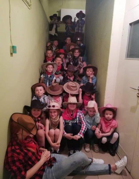 1.czerwca w naszym przedszkolu odbyła się prawdziwa podróż w czasie. Przenieśliśmy się  na Dziki Zachód – do czasów zręcznych kowbojów, dzielnych szeryfów i  poskramiaczy bizonów. Każdy uczestnik zabawy zaopatrzył się w odpowiedni strój, a na korytarzu pojawiły się tory z zadaniami rodem z Ameryki. Było rzucanie piłką do celu, poszukiwanie złota, zarzucanie „lassa”na konia, balansowanie z kapeluszem kowbojskim, przejście pod przeszkodą, wyścigi w workach. Dzieci bawiły się świetnie. Na koniec każdy otrzymał drobny upominek. Każda grupa zrobiła sobie też zdjęcie przy, przygotowanym na tę okazję, wozie amerykańskich pionierów. To był naprawdę wystrzałowy Dzień Dziecka.