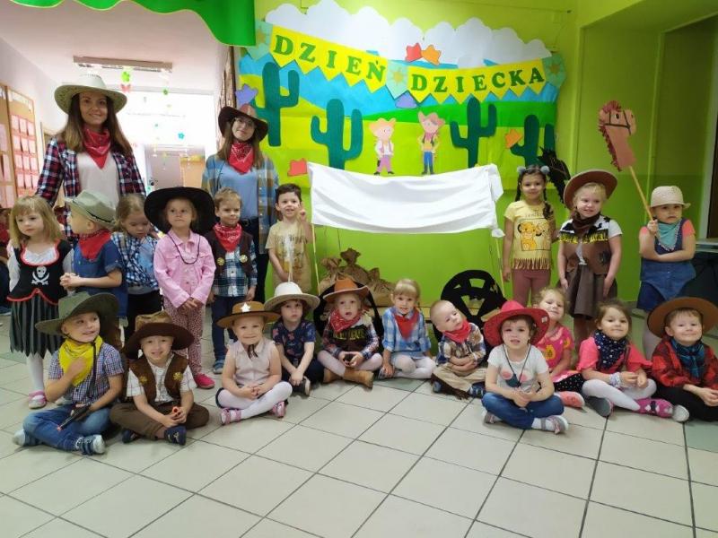 1.czerwca w naszym przedszkolu odbyła się prawdziwa podróż w czasie. Przenieśliśmy się  na Dziki Zachód – do czasów zręcznych kowbojów, dzielnych szeryfów i  poskramiaczy bizonów. Każdy uczestnik zabawy zaopatrzył się w odpowiedni strój, a na korytarzu pojawiły się tory z zadaniami rodem z Ameryki. Było rzucanie piłką do celu, poszukiwanie złota, zarzucanie „lassa”na konia, balansowanie z kapeluszem kowbojskim, przejście pod przeszkodą, wyścigi w workach. Dzieci bawiły się świetnie. Na koniec każdy otrzymał drobny upominek. Każda grupa zrobiła sobie też zdjęcie przy, przygotowanym na tę okazję, wozie amerykańskich pionierów. To był naprawdę wystrzałowy Dzień Dziecka.