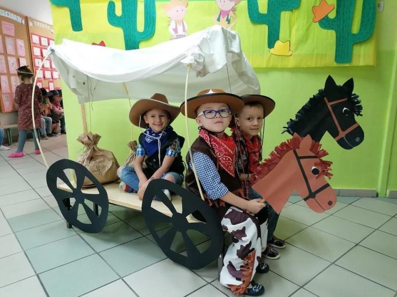 1.czerwca w naszym przedszkolu odbyła się prawdziwa podróż w czasie. Przenieśliśmy się  na Dziki Zachód – do czasów zręcznych kowbojów, dzielnych szeryfów i  poskramiaczy bizonów. Każdy uczestnik zabawy zaopatrzył się w odpowiedni strój, a na korytarzu pojawiły się tory z zadaniami rodem z Ameryki. Było rzucanie piłką do celu, poszukiwanie złota, zarzucanie „lassa”na konia, balansowanie z kapeluszem kowbojskim, przejście pod przeszkodą, wyścigi w workach. Dzieci bawiły się świetnie. Na koniec każdy otrzymał drobny upominek. Każda grupa zrobiła sobie też zdjęcie przy, przygotowanym na tę okazję, wozie amerykańskich pionierów. To był naprawdę wystrzałowy Dzień Dziecka.