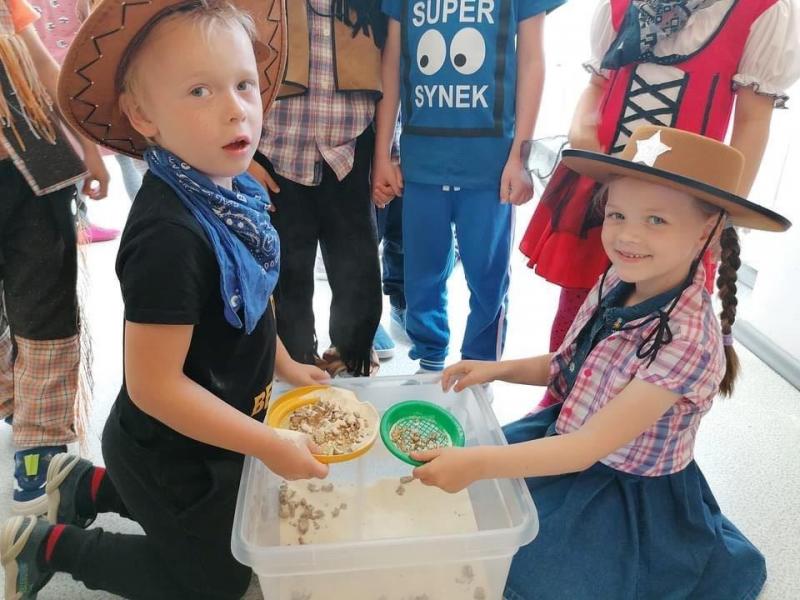 1.czerwca w naszym przedszkolu odbyła się prawdziwa podróż w czasie. Przenieśliśmy się  na Dziki Zachód – do czasów zręcznych kowbojów, dzielnych szeryfów i  poskramiaczy bizonów. Każdy uczestnik zabawy zaopatrzył się w odpowiedni strój, a na korytarzu pojawiły się tory z zadaniami rodem z Ameryki. Było rzucanie piłką do celu, poszukiwanie złota, zarzucanie „lassa”na konia, balansowanie z kapeluszem kowbojskim, przejście pod przeszkodą, wyścigi w workach. Dzieci bawiły się świetnie. Na koniec każdy otrzymał drobny upominek. Każda grupa zrobiła sobie też zdjęcie przy, przygotowanym na tę okazję, wozie amerykańskich pionierów. To był naprawdę wystrzałowy Dzień Dziecka.