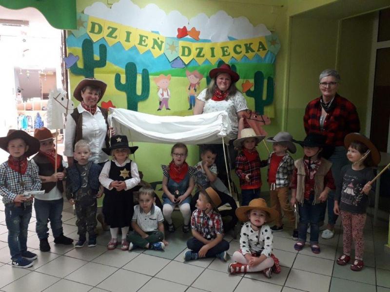 1.czerwca w naszym przedszkolu odbyła się prawdziwa podróż w czasie. Przenieśliśmy się  na Dziki Zachód – do czasów zręcznych kowbojów, dzielnych szeryfów i  poskramiaczy bizonów. Każdy uczestnik zabawy zaopatrzył się w odpowiedni strój, a na korytarzu pojawiły się tory z zadaniami rodem z Ameryki. Było rzucanie piłką do celu, poszukiwanie złota, zarzucanie „lassa”na konia, balansowanie z kapeluszem kowbojskim, przejście pod przeszkodą, wyścigi w workach. Dzieci bawiły się świetnie. Na koniec każdy otrzymał drobny upominek. Każda grupa zrobiła sobie też zdjęcie przy, przygotowanym na tę okazję, wozie amerykańskich pionierów. To był naprawdę wystrzałowy Dzień Dziecka.