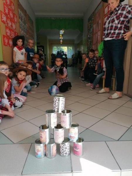 1.czerwca w naszym przedszkolu odbyła się prawdziwa podróż w czasie. Przenieśliśmy się  na Dziki Zachód – do czasów zręcznych kowbojów, dzielnych szeryfów i  poskramiaczy bizonów. Każdy uczestnik zabawy zaopatrzył się w odpowiedni strój, a na korytarzu pojawiły się tory z zadaniami rodem z Ameryki. Było rzucanie piłką do celu, poszukiwanie złota, zarzucanie „lassa”na konia, balansowanie z kapeluszem kowbojskim, przejście pod przeszkodą, wyścigi w workach. Dzieci bawiły się świetnie. Na koniec każdy otrzymał drobny upominek. Każda grupa zrobiła sobie też zdjęcie przy, przygotowanym na tę okazję, wozie amerykańskich pionierów. To był naprawdę wystrzałowy Dzień Dziecka.