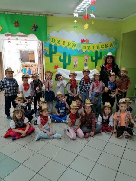 1.czerwca w naszym przedszkolu odbyła się prawdziwa podróż w czasie. Przenieśliśmy się na Dziki Zachód – do czasów zręcznych kowbojów, dzielnych szeryfów i poskramiaczy bizonów. Każdy uczestnik zabawy zaopatrzył się w odpowiedni strój, a na korytarzu pojawiły się tory z zadaniami rodem z Ameryki. Było rzucanie piłką do celu, poszukiwanie złota, zarzucanie „lassa”na konia, balansowanie z kapeluszem kowbojskim, przejście pod przeszkodą, wyścigi w workach. Dzieci bawiły się świetnie. Na koniec każdy otrzymał drobny upominek. Każda grupa zrobiła sobie też zdjęcie przy, przygotowanym na tę okazję, wozie amerykańskich pionierów. To był naprawdę wystrzałowy Dzień Dziecka.
