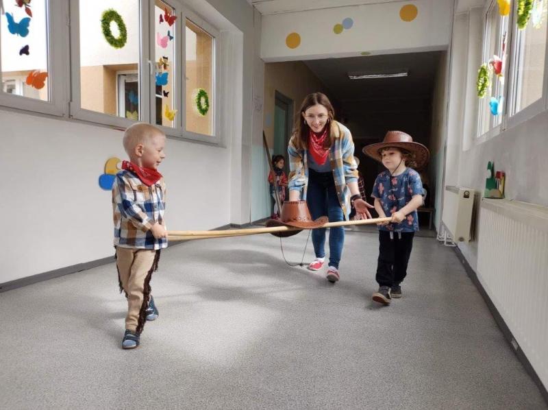 1.czerwca w naszym przedszkolu odbyła się prawdziwa podróż w czasie. Przenieśliśmy się  na Dziki Zachód – do czasów zręcznych kowbojów, dzielnych szeryfów i  poskramiaczy bizonów. Każdy uczestnik zabawy zaopatrzył się w odpowiedni strój, a na korytarzu pojawiły się tory z zadaniami rodem z Ameryki. Było rzucanie piłką do celu, poszukiwanie złota, zarzucanie „lassa”na konia, balansowanie z kapeluszem kowbojskim, przejście pod przeszkodą, wyścigi w workach. Dzieci bawiły się świetnie. Na koniec każdy otrzymał drobny upominek. Każda grupa zrobiła sobie też zdjęcie przy, przygotowanym na tę okazję, wozie amerykańskich pionierów. To był naprawdę wystrzałowy Dzień Dziecka.