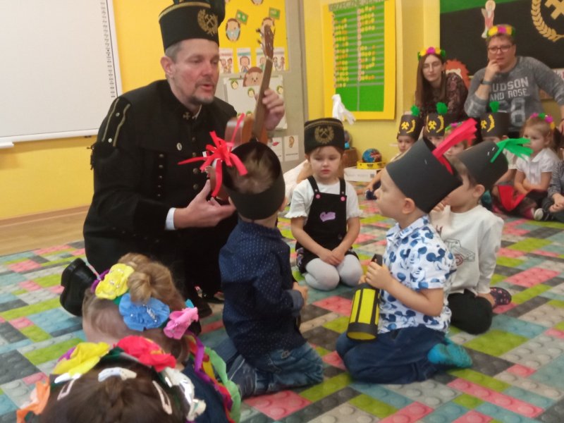 Z okazji dnia św.Barbary do naszego przedszkola zawitał wyjątkowy gość, by razem z dziećmi obchodzić swoje święto. Górnik spotkał się z każdą grupą. Podczas tych spotkań opowiadał o pracy pod ziemią, pokazywał (i pozwolił przymierzyć!) codzienny strój roboczy górnika. Odpowiadał na pytania, a nawet zagrał i zaśpiewał z dziećmi piosenkę. To było bardzo miłe i wesołe spotkanie.