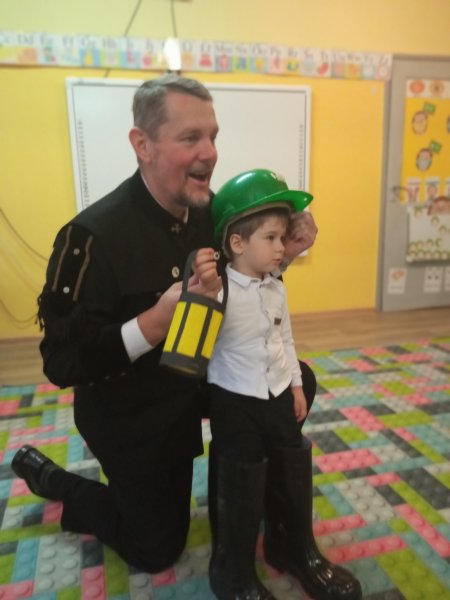 Z okazji dnia św.Barbary do naszego przedszkola zawitał wyjątkowy gość, by razem z dziećmi obchodzić swoje święto. Górnik spotkał się z każdą grupą. Podczas tych spotkań opowiadał o pracy pod ziemią, pokazywał (i pozwolił przymierzyć!) codzienny strój roboczy górnika. Odpowiadał na pytania, a nawet zagrał i zaśpiewał z dziećmi piosenkę. To było bardzo miłe i wesołe spotkanie.
