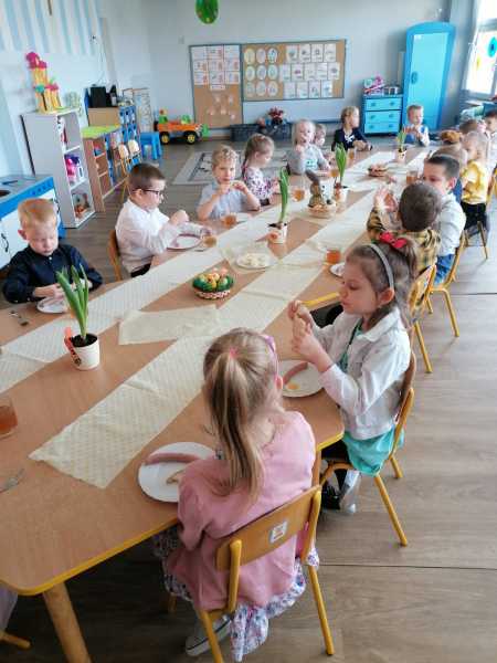 W środę we wszystkich grupach odbyły się świąteczne spotkania. Było poszukiwanie ukrytych prezentów, spotkanie z wesołymi zającami, wielkanocne gry i zabawy, no i oczywiście śniadanie przy pięknie nakrytym stole.