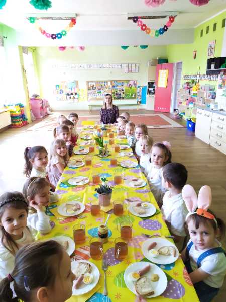 W środę we wszystkich grupach odbyły się świąteczne spotkania. Było poszukiwanie ukrytych prezentów, spotkanie z wesołymi zającami, wielkanocne gry i zabawy, no i oczywiście śniadanie przy pięknie nakrytym stole.