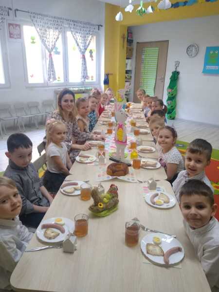 W środę we wszystkich grupach odbyły się świąteczne spotkania. Było poszukiwanie ukrytych prezentów, spotkanie z wesołymi zającami, wielkanocne gry i zabawy, no i oczywiście śniadanie przy pięknie nakrytym stole.