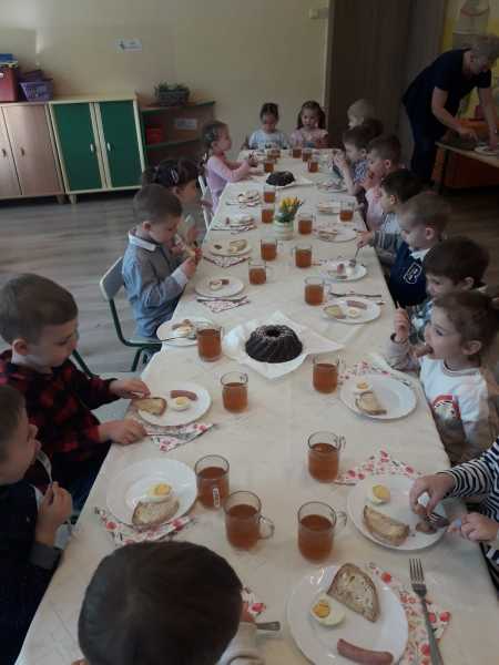 W środę we wszystkich grupach odbyły się świąteczne spotkania. Było poszukiwanie ukrytych prezentów, spotkanie z wesołymi zającami, wielkanocne gry i zabawy, no i oczywiście śniadanie przy pięknie nakrytym stole.