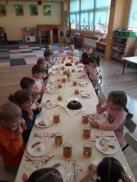 W środę we wszystkich grupach odbyły się świąteczne spotkania. Było poszukiwanie ukrytych prezentów, spotkanie z wesołymi zającami, wielkanocne gry i zabawy, no i oczywiście śniadanie przy pięknie nakrytym stole.