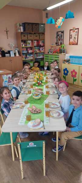 W środę we wszystkich grupach odbyły się świąteczne spotkania. Było poszukiwanie ukrytych prezentów, spotkanie z wesołymi zającami, wielkanocne gry i zabawy, no i oczywiście śniadanie przy pięknie nakrytym stole.