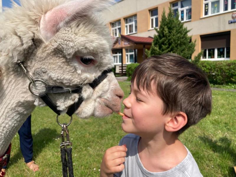 We wtorek w naszym przedszkolu pojawili się sympatyczni goście. Dwa alpaki i królik wraz z opiekunką uczyły naszych przedszkolaków, jak należy traktować zwierzęta. Dzieci miały okazję dowiedzieć się m.in. skąd pochodzą alpaki, co jedzą i co można zrobić z ich wełny. Każdy chętny mógł nakarmić alpakę, pogłaskać ją i zabrać na krótki spacer.