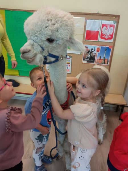 We wtorek w naszym przedszkolu pojawili się sympatyczni goście. Dwa alpaki i królik wraz z opiekunką uczyły naszych przedszkolaków, jak należy traktować zwierzęta. Dzieci miały okazję dowiedzieć się m.in. skąd pochodzą alpaki, co jedzą i co można zrobić z ich wełny. Każdy chętny mógł nakarmić alpakę, pogłaskać ją i zabrać na krótki spacer.