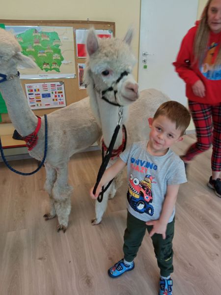 We wtorek w naszym przedszkolu pojawili się sympatyczni goście. Dwa alpaki i królik wraz z opiekunką uczyły naszych przedszkolaków, jak należy traktować zwierzęta. Dzieci miały okazję dowiedzieć się m.in. skąd pochodzą alpaki, co jedzą i co można zrobić z ich wełny. Każdy chętny mógł nakarmić alpakę, pogłaskać ją i zabrać na krótki spacer.