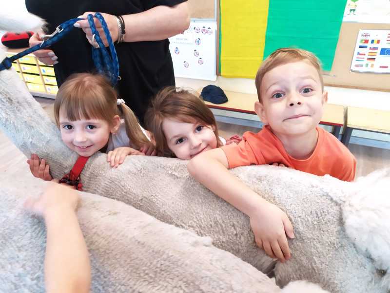 We wtorek w naszym przedszkolu pojawili się sympatyczni goście. Dwa alpaki i królik wraz z opiekunką uczyły naszych przedszkolaków, jak należy traktować zwierzęta. Dzieci miały okazję dowiedzieć się m.in. skąd pochodzą alpaki, co jedzą i co można zrobić z ich wełny. Każdy chętny mógł nakarmić alpakę, pogłaskać ją i zabrać na krótki spacer.
