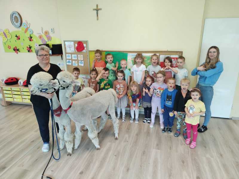 We wtorek w naszym przedszkolu pojawili się sympatyczni goście. Dwa alpaki i królik wraz z opiekunką uczyły naszych przedszkolaków, jak należy traktować zwierzęta. Dzieci miały okazję dowiedzieć się m.in. skąd pochodzą alpaki, co jedzą i co można zrobić z ich wełny. Każdy chętny mógł nakarmić alpakę, pogłaskać ją i zabrać na krótki spacer.
