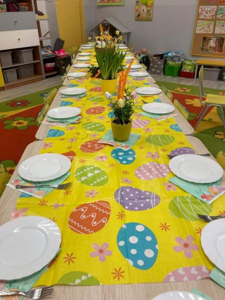We wtorek w naszym przedszkolu odbyły się uroczyste śniadania wielkanocne. Już przed wejściem czekali niezwykli goście; para zajączków przybijała piątki, przytulała dzieci i  witała wszystkich wchodzących. A to dopiero początek atrakcji. Każda grupa zasiadła do odświętnie przystrojonego stołu, żeby wspólnie zjeść świąteczne przysmaki.  Po śniadaniu za oknem znów pojawiły się zające, tym razem zachęcały do poszukiwania ukrytych prezentów.  Wszystkie dzieci wyruszyły więc na podwórko, żeby odnaleźć koszyczki z upominkami. Po krótkiej chwili każdy wracał ze swoim prezentem.