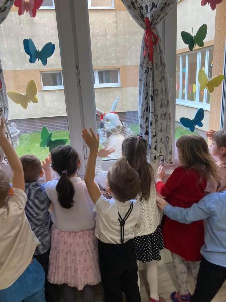 We wtorek w naszym przedszkolu odbyły się uroczyste śniadania wielkanocne. Już przed wejściem czekali niezwykli goście; para zajączków przybijała piątki, przytulała dzieci i  witała wszystkich wchodzących. A to dopiero początek atrakcji. Każda grupa zasiadła do odświętnie przystrojonego stołu, żeby wspólnie zjeść świąteczne przysmaki.  Po śniadaniu za oknem znów pojawiły się zające, tym razem zachęcały do poszukiwania ukrytych prezentów.  Wszystkie dzieci wyruszyły więc na podwórko, żeby odnaleźć koszyczki z upominkami. Po krótkiej chwili każdy wracał ze swoim prezentem.