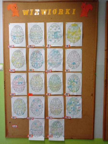 Na przedszkolnym korytarzu, jak co roku pojawiła się piękna dekoracja, przy której można zrobić sobie zdjęcie, a na gazetkach zawisły  wielkanocne prace dzieci.