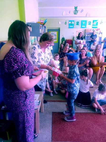 Młodsze Wiewióreczki z grupy przygotowały niespodziankę i pożegnały starszych kolegów wierszykami oraz samodzielnie wykonanymi zakładkami. Potem były podziękowania złożone wszystkim pracownikom naszego przedszkola.