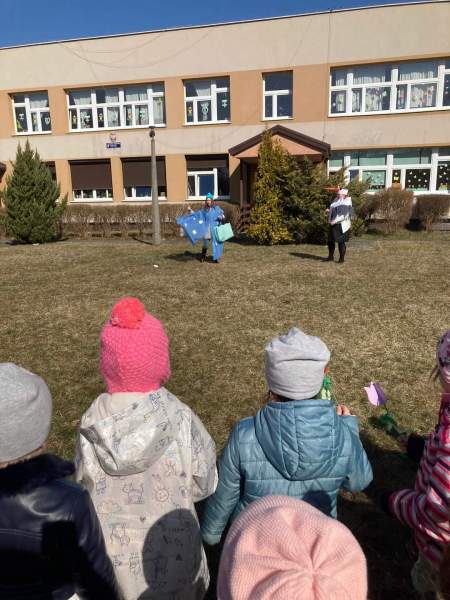21 marca wraz z bocianem  pożegnaliśmy zimę i powitaliśmy wiosnę. Wesołe spotkanie  z niezwykłymi gośćmi odbyło się na podwórku w promieniach ciepłego, wiosennego słońca. Po powrocie do sal chętne dzieci kolorowały obrazki otrzymane od Pani Wiosny.